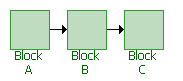In a series configuration, all items must work for the system to work. In the RBD shown next, the system fails if either Block A, Block B or Block C fails.