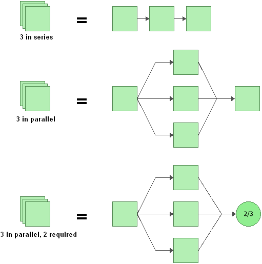 When this option is selected, you can enter the number of components represented by the block and specify whether they are connected in series or in parallel. If they are connected in parallel, you can also specify how many of the items are required to be functioning in order for the multi block to be functioning. The images shown next provide the equivalent configurations for multi blocks representing three blocks in series, three blocks in parallel and three blocks where at least two of the three must be functioning.