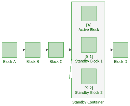 The figure shown next includes a standby container with three items in standby redundancy configuration where one component is active and the other two components are on standby. In this configuration, one block in the container must be operating or, because the container is part of a series configuration, the system will fail.