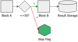A stop flag halts the simulation process when it is encountered. No further simulations, runs or analyses will be performed until you next simulate the flowchart. A stop flag can have any number of incoming paths, and no outgoing paths. The following example shows how a stop flag may be used to stop the simulation from progressing when a certain condition is met.