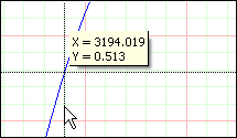 If the pointer is on a plot line (e.g., a failure intensity line, a point availability line, etc.), pressing SHIFT and clicking the line will track the line when you move the pointer. A crosshair will be displayed showing the current location on the line. As you move the pointer left or right, the crosshair will mirror the movement but will stay on the line and the current coordinates on the line will be displayed (i.e., Y is calculated based on X), as shown next.