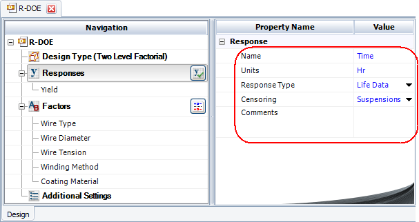 Response Type specifies whether you will be using life data (e.g., failure times) for the response values. If you select Life Data from the drop-down list, the data sheet will be configured for reliability DOE. Note that only one response in a given design can contain life data.
