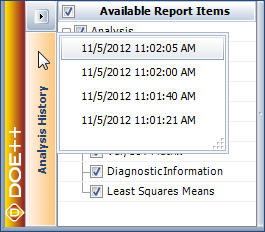 Note that you can apply the settings from a prior analysis only if it is based on the same design and response data as the current analysis. If this isn't the case for the displayed analysis results, then the results will include red text that says, "The design has been modified since this history was created. These settings can no longer be applied to this response."