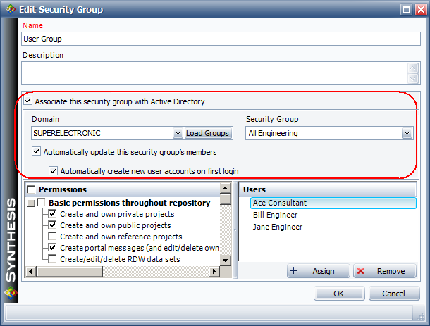 Automatically create new user accounts on first login. If a member of the AD group does not already have a Synthesis user account, it will be created automatically (and assigned to this security group) the first time he/she tries to connect via any of the Synthesis desktop applications.