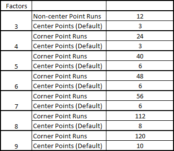 This table provides information about how many non-center point runs will be used in the design, based on the number of factors, as well as how many center points will be used by default. For example, if you are using 5 factors, the design will use 40 non-center point runs and will use 6 center points by default.
