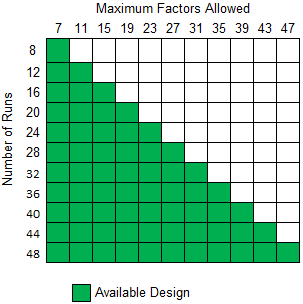 This table provides information about the available combinations of the number of factors and the number of runs. The number of runs in a Plackett-Burman design is always a multiple of four. The number of factors can be up to one less than the number of runs. For example, this table shows that a design using 20 runs may use up to 19 factors.