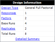 In addition to the Design Type, Responses, Factors and Replicates you chose for the design, the following calculated values are shown: