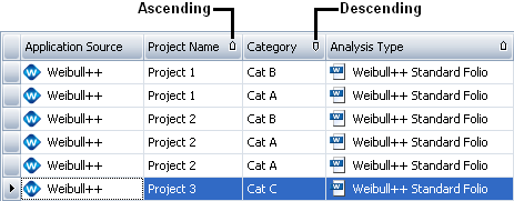 To sort the grid by multiple columns, right-click each column in the desired order and choose Sort Ascending or Sort Descending each time. For example, the following picture shows Synthesis Explorer data sorted first by project (ascending) and then by category (descending).