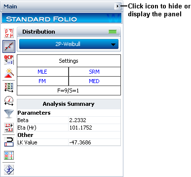 The control panel can be toggled between hidden and displayed states by clicking the Hide or Show icon in its title bar, as shown below using a Weibull++ standard folio as an example.