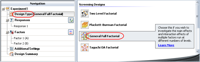 To create a general full factorial design, follow the steps outlined next. For more general information on building designs, see Building a New Design.