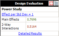The Design Evaluation area is used to help you determine the efficiency of the current design. In the picture shown next, the main effect that is the least likely to be detected by design has a 79.96% of being detected. Click the Detailed Results link in this area to view details of the evaluation results (including the probability of detection, or power, for individual effects and interactions).