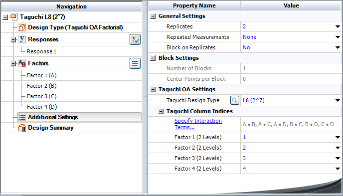 The Taguchi OA design is given in the "Taguchi L8 (2^7)" folio. The four factors were assigned to the first 4 columns under the Additional Settings header on the Design tab.