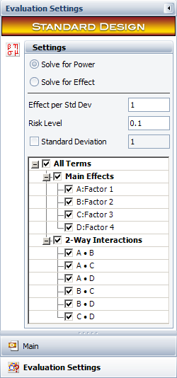 On the Evaluation Settings page of the control panel, specify that you will solve for power (i.e., the probability that the design will detect an active effect) and select to include all main effects and 2-way interactions in the evaluation.