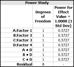 According to this table, if any of the displayed main effects or interaction effects is active, there is a 57.27% chance that the design will detect it.