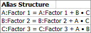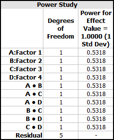 For example, according to this table, the main effect of factor A is aliased with the interaction BC. Thus, BC is not shown in the Power Study table.