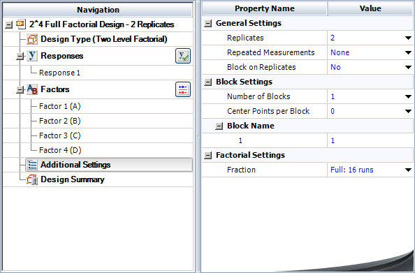 In this example, the Design Evaluation tool in DOE++ will be used to compare a Taguchi OA design to a two level full factorial design. The designs will be compared in terms of alias structure, detection power and resource constraints. Assume a group of engineers want to investigate the main effects and 2-way interaction effects of 4 factors run at 2 levels each. One option is to use the first 4 columns of the Taguchi L8 (2^7) with 2 replicates; the other option is to use a full factorial design. Both designs require 16 test samples. In the steps that follow, both designs will be evaluated, and the better design will be improved before the engineers agree to use it.