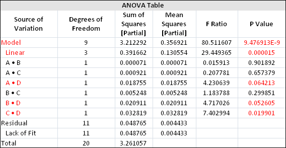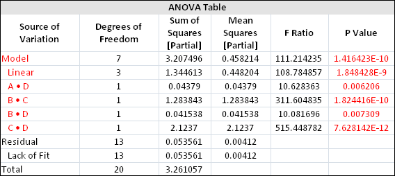 In the ANOVA table, you can see that effects AD, BD and CD are significant. The p value for effect BC is also relatively close to the risk level of 0.1. Therefore, you decide to include it in the final model.