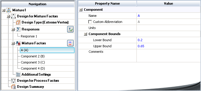 Rename the folio by clicking the Mixture1 heading in the navigation panel and entering Extreme Vertex Design for the Name in the input panel.