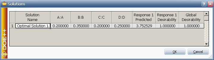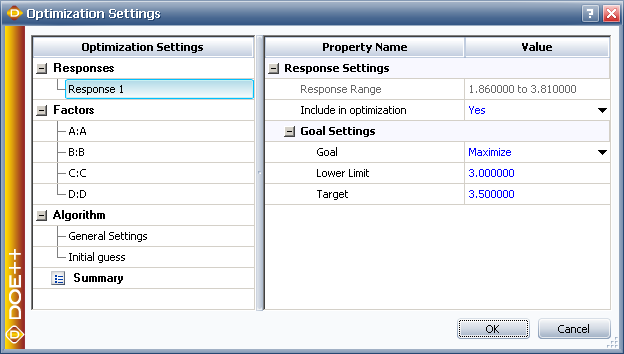 In the Response Settings window that appears, use the settings shown next and click OK. These settings indicate that you want to maximize Response 1, with values above 3.5 being considered 100% desirable and values below 3.0 being undesirable.