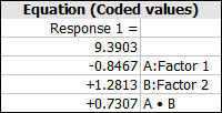 The corresponding model for this table is y = 9.3903 - 0.8467x1 + 1.2813x2 + 0.7303x1x2.