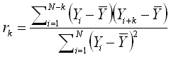 The Residual Autocorrelation* plot shows a measure of the correlation between the residual values for the series of runs (sorted by run order) and one or more lagged versions of the series of runs. The default number of lags is the number of observations, n, divided by 4. If you select Custom Lags in the Auto-Correlation Options area, you can specify up to n -1 lags. The correlation is calculated as follows: