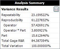 An analysis summary is shown when the current measurement data has been analyzed using the current settings. This area breaks down the percentage of measurement variance due to repeatability, reproducibility and the measured part.