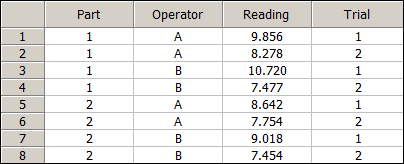 As an example, suppose a scale used to weigh two parts (in pounds). Part 1 is measured four times: twice by Operator A and twice by Operator B. Part 2 is also measured twice by each operator. The resulting data is shown next.