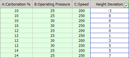 Each row represents a test run. The green columns display the factor level combinations to be used in each run, and the last column records the response values measured for each run.