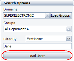 Enter or select the domain name in the Domains field. If your organization’s directory is large, you may also choose to limit the search to specific groups by clicking Load Groups and then choosing an option from the drop-down list. You can also use the Filter By field to further limit the search. When you have specified the desired filters, click Load Users to update the table.
