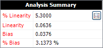 Linearity represents the variation of the measurements due to the gage linearity. To calculate this value, you must specify the process standard deviation on the Analysis Settings page of the control panel.