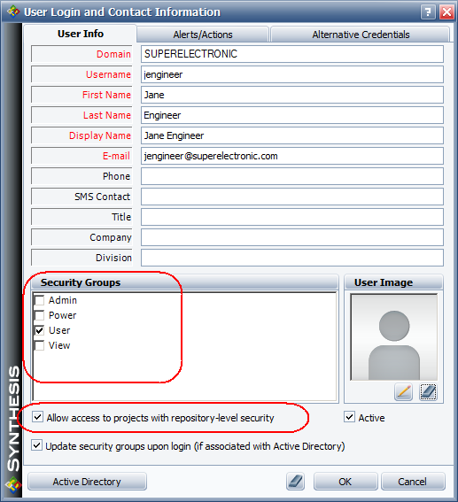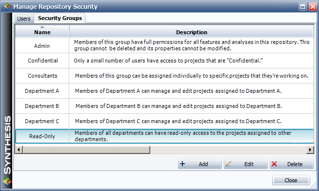 User Accounts and Security Groups: Assign each user account to an appropriate security group. This can be one of the four security groups that are created by default in each new Synthesis repository — Admin, Power, User (Read/Write) or View (Read-Only) — or you can configure new or existing security groups to meet your particular needs.