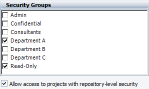 Project Security: Accept the default option on the Security tab of the Project Properties for all public and reference projects (Project > Security > Project Security). Note that if a user belongs to more than one security group (and the Allow access to projects with repository-level security check box is selected for his/her user account), that user will have the combined permissions of those groups in any project that is set to repository-level security.