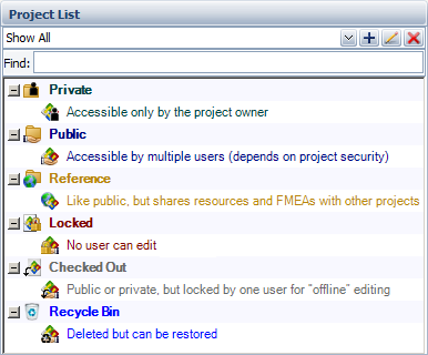 A reference project is like any regular public project, except that you can share its resources and FMEAs with other projects in the database. This gives you a pool of resources that can be used throughout the database by specified users (based on the security settings for the reference project), while allowing you to maintain fully functional analyses within the reference project itself. (For more information, see Local, Global and Reference Resources, and Linked FMEAs in the Xfmea/RCM++/RBI documentation.)