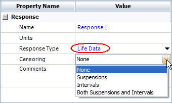 Reliability designs allow you to enter life data (i.e., times-to-failure data) as the response. Depending on the censoring type you select, other information may also be included. When you are selecting the design settings in a design folio, you can select Life Data as the response type and then choose an option from the Censoring drop-down list on the Design tab. (See Adding, Removing and Editing Responses.)