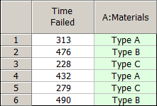 Life Data with Suspensions (Right Censored Data): The data points for units that did not fail during the observation period are known as suspensions or right censored data, which means that the event of interest (i.e., the failure time) is to the right of our data point on the time scale. For example, if we tested six units and only four had failed by the end of the test, the observed operating time of the two units that did not fail would be referred to as right censored data. Failure times with right censored data are shown next in the context of a one factor reliability design (e.g., the last data point is a suspension at time = 500).