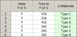 Life Data with Both Suspensions and Intervals: This is the most general data type, as it includes all of the possible censoring types. Failure times with interval and right censored data type are shown next in the context of a factorial reliability design. (Note that the first data point is actually an exact failure time since it has an interval with identical start and end times.)