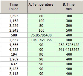 Life Data Columns are present only for reliability DOE. The columns that are available depend on the type of life data specified when the design was created. These columns take the place of the response column(s) in a standard design, and are used to calculate the underlying response for the design, which is considered to be time.