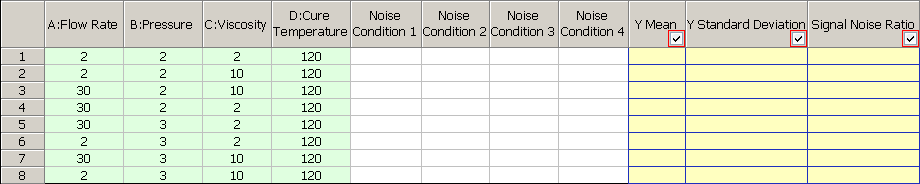 In analyzing the data set, DOE++ can calculate results for the Y Mean, Y Standard Deviation and Signal Noise Ratio columns. You will select one or more of these columns to be used as the "responses" for the analysis by selecting the check boxes in the column headers.