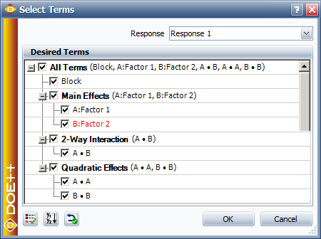 The check boxes in the Desired Terms area allow you to select which terms you want to include in the analysis/evaluation. Note that if you select an interaction term, you must also select the interacting effects under the Main Effects heading (e.g., if you select interaction AC, then you must select the main effects A and C individually).