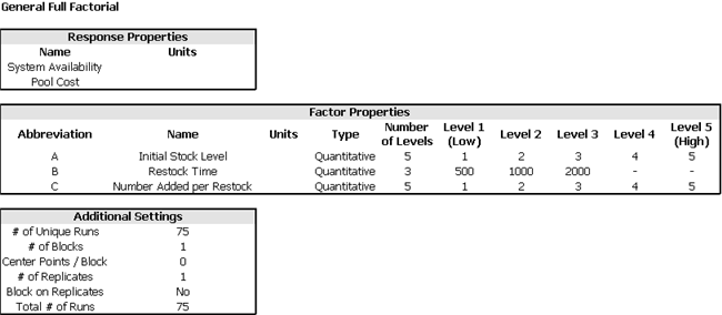 The DOE++ experiment used in our example is a general full factorial design using the following settings: