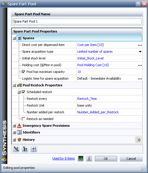 The spare part pool that is used by the tasks in our example is configured as follows: