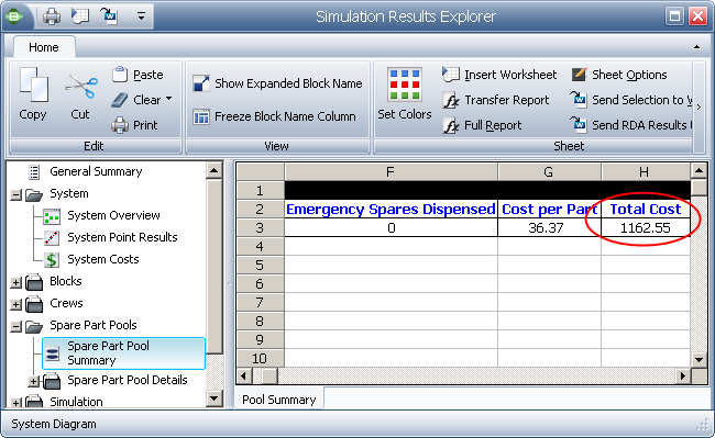 The results show a mean system availability of 0.8924 and a total cost for the pool of $1162.55. These values are very close to the estimated values in DOE++.