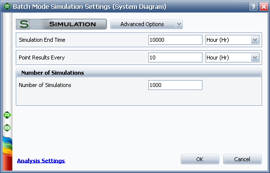 Click the Edit Simulation Settings button to open the Batch Mode Simulation Settings window. This is an abbreviated version of BlockSim's Maintainability/Availability Simulation window or of the RENO simulation window, depending on whether the associated diagram is a simulation RBD or a RENO flowchart. The settings that you specify will apply to the simulation performed for each row (i.e., each factor setting combination). Specify the desired simulation settings and click OK to return to the Worksheet Simulation window.