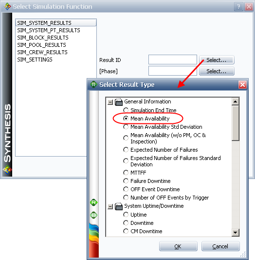 If the associated diagram is a BlockSim simulation RBD, define the function to calculate from each simulation. This is done by clicking the cell associated with the result column to open a limited version of the Function Wizard, where only the simulation functions are available.