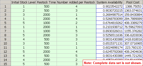 A single optimal solution is found with Initial Stock Level = 1, Restock Time = 975.1698 and Number Added per Restock = 5. This gives a system availability of .9048 and pool cost of 1183.30.