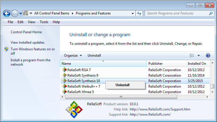 In the Uninstall or change a program window, double-click ReliaSoft Synthesis 10 and follow the prompts.