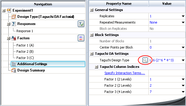 The table can be accessed from the Design tab of the standard design folio while configuring a Taguchi OA factorial design. To open it, click the Additional Settings heading in the navigation panel and then click the View Alias Table icon in the input panel.