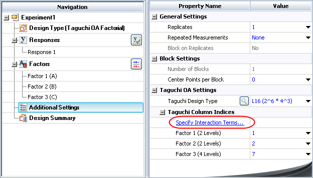 The window can be accessed from the Design tab of the standard design folio while configuring a Taguchi OA factorial design. To open it, click the Additional Settings heading in the navigation panel and then click the Specify Interaction Terms link in the input panel.