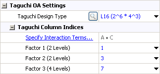 The Specify Interaction Terms window helps you assign factors to columns in the orthogonal array in a way that will not alias main effects or any of the selected interaction terms with any other terms. In other words, it helps you configure a design that you can use to determine whether any of the main effects or selected interaction effects are significant.