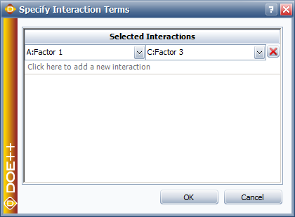 Once you click outside the row, the interaction term (e.g., "A·C") will appear. To remove the term, click inside its row and then click the red X.